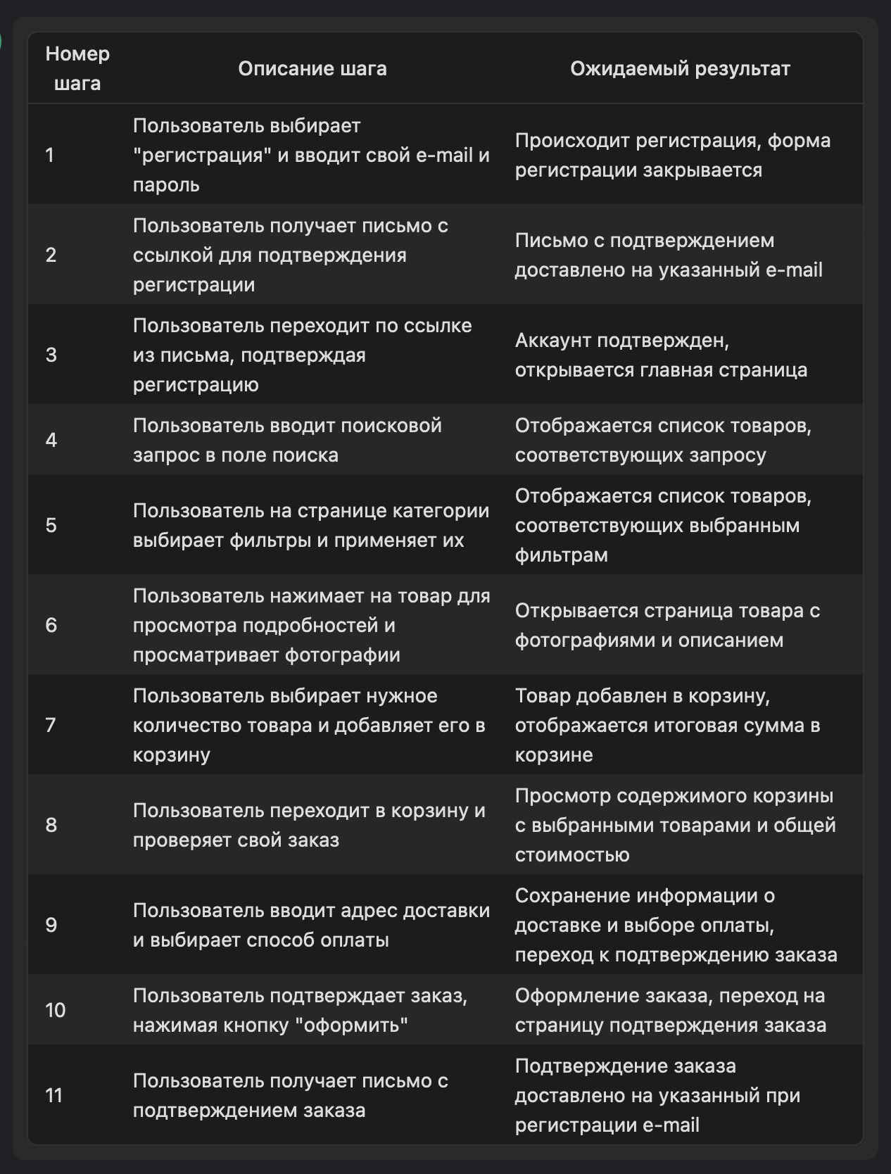 Кейс включается в себя путь от самого начала, т.е. с регистрации или авторизации пользователя. Далее виртуальный пользователь пользуется каталогом или поиском для фильтрации товаров. Выбирает товар изучая его через карточку товара. Попутно проверяя налицие цены, изображения товара, также наличие описания или комментариев. Далее пользователь кладет товар в корзину и наконец оформляет покупку. Бизнес-кейс закончится финальной проверкой получения заказа на вашей стороне.